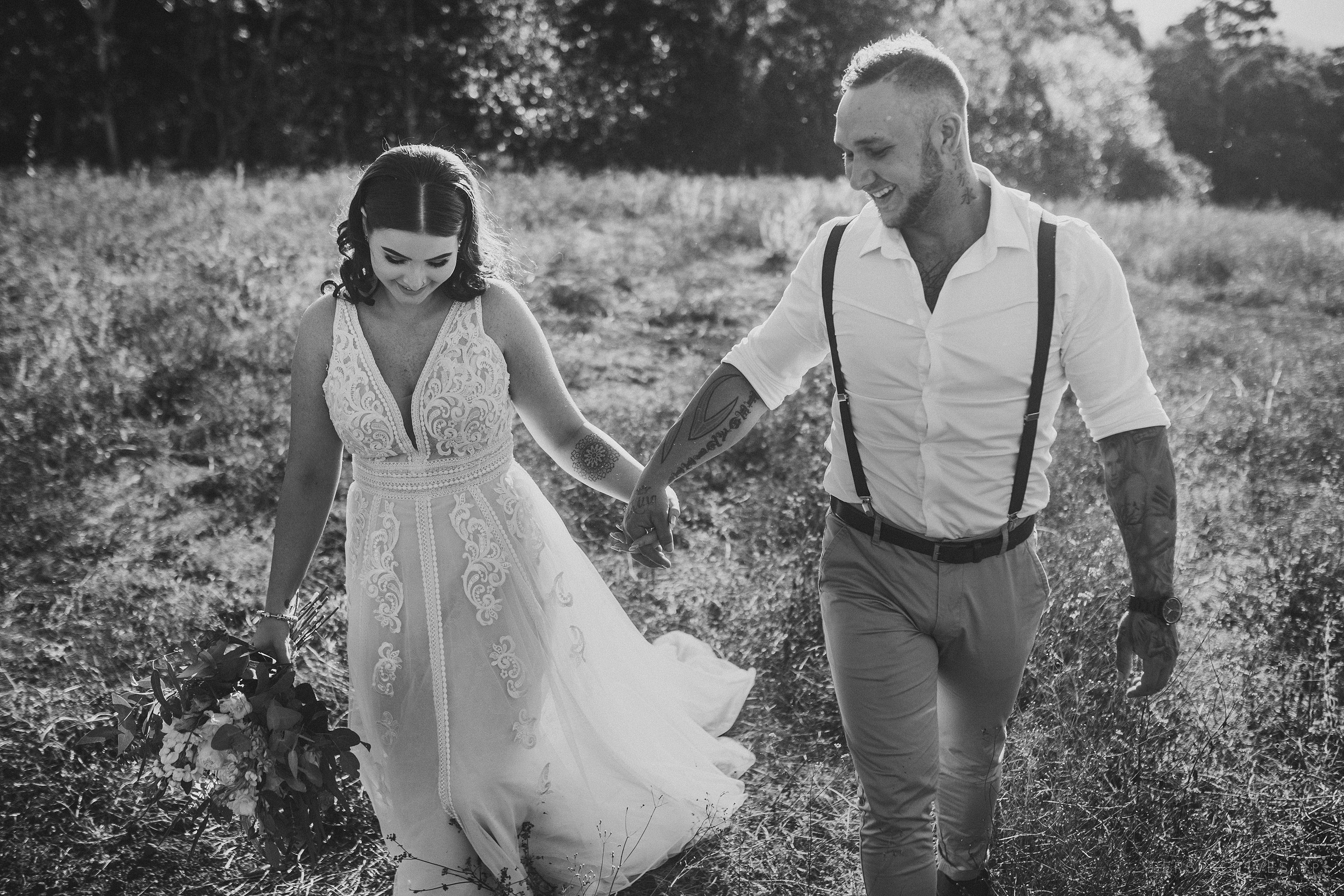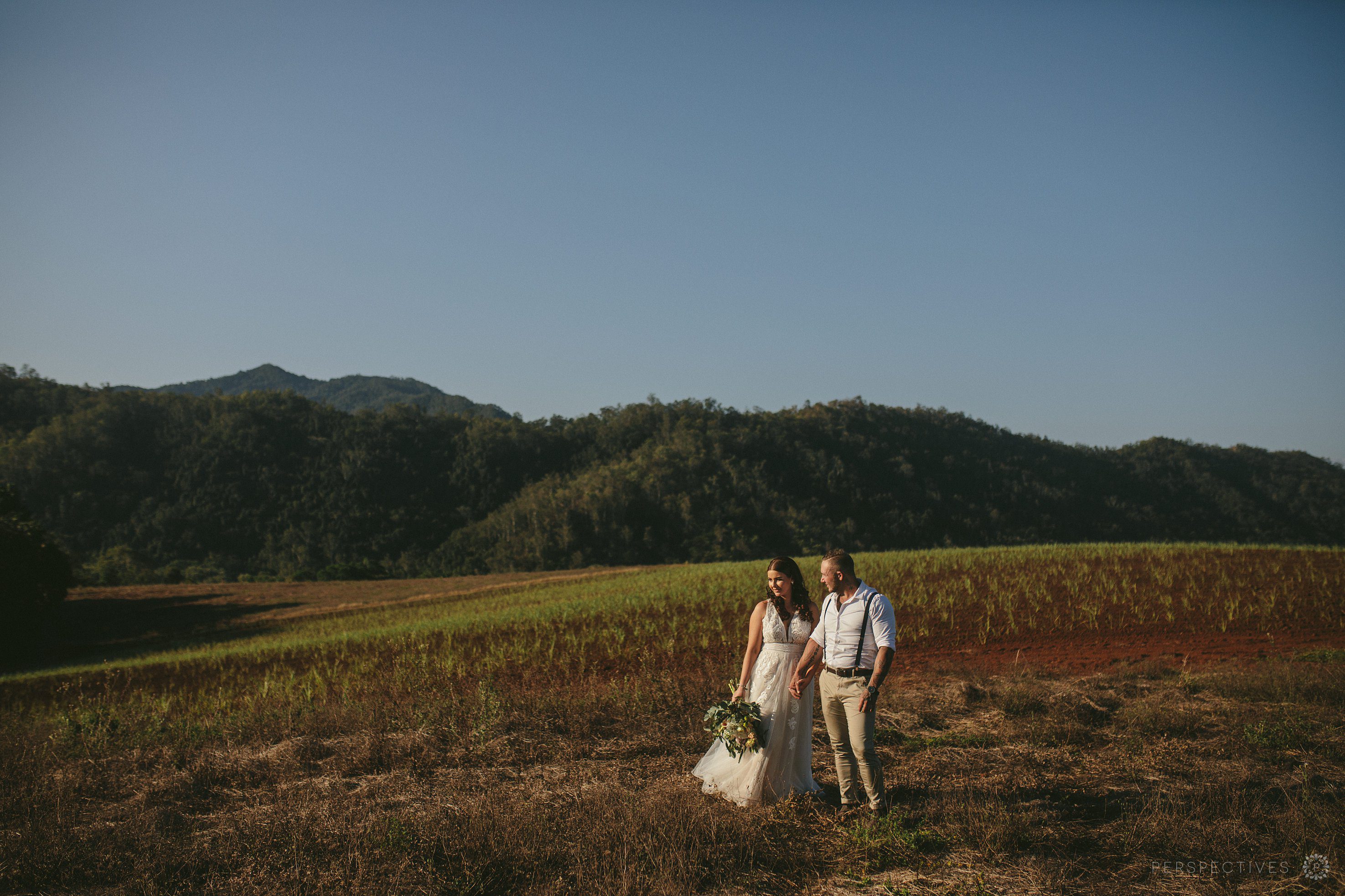 As the golden sunlight flooded the hills, we went for a quick adventure session – with ‘adventure’ being the key word … Jess and James happily bashed their way though grass, across cane fields, and over stones. Perhaps this was somewhat helped by the fact that Jess opted for ever-practical chucks instead of wedding heels – we love rad shoe choices like that!
